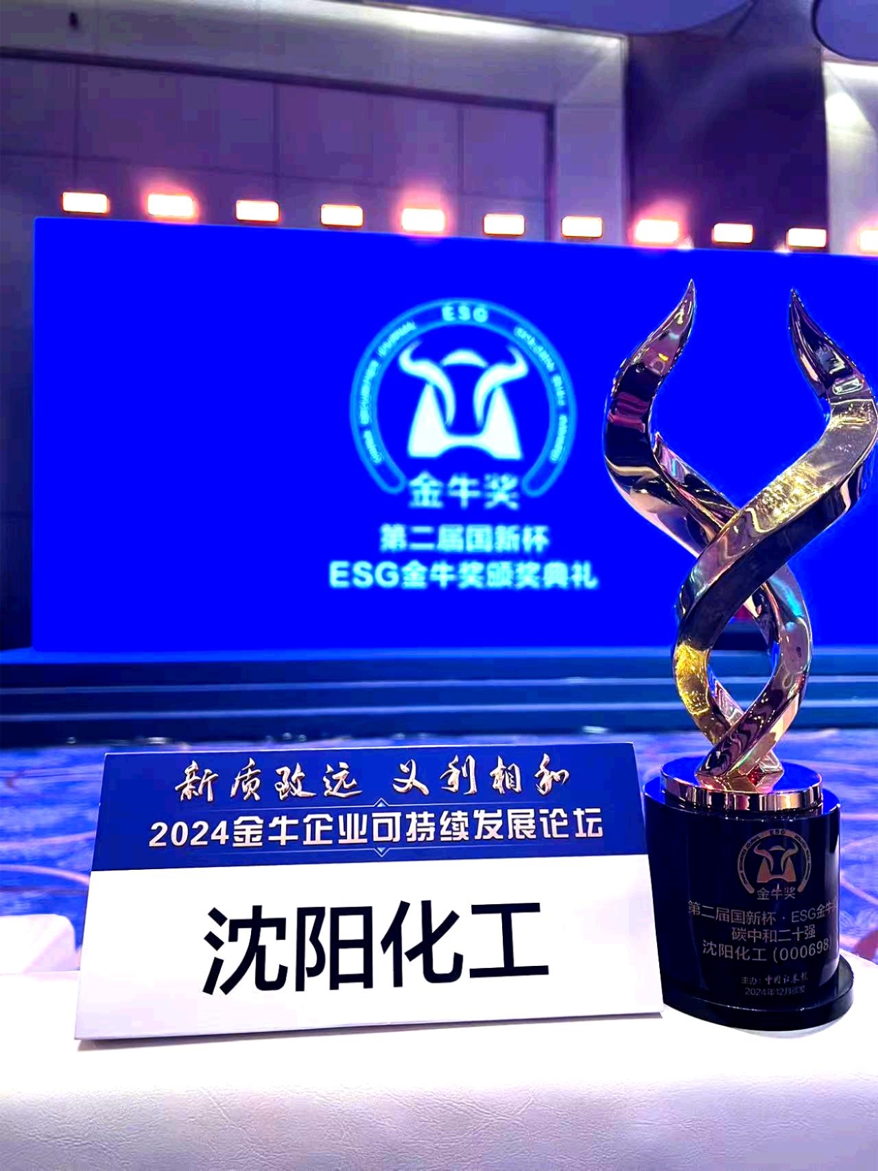 12月6日,由《中國證券報(bào)》攜手中國國新控股有限責(zé)任公司旗下國新咨詢有限責(zé)任公司聯(lián)合舉辦的“新質(zhì)致遠(yuǎn) 義利相和——2024金牛企業(yè)可持續(xù)發(fā)展論壇”暨“第二屆國新杯·ESG金牛獎(jiǎng)?lì)C獎(jiǎng)典禮”在上海圓滿落幕,沈陽化工股份有限公司(以下簡稱“沈陽化工”)在此次頒獎(jiǎng)典禮上榮獲“國新杯·ESG金牛獎(jiǎng)碳中和二十強(qiáng)”獎(jiǎng)項(xiàng)。這是公司繼去年獲得“第一屆國新杯·ESG金牛獎(jiǎng)碳中和五十強(qiáng)”獎(jiǎng)項(xiàng)后,再次獲得的ESG殊榮。
